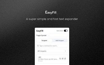 Easyfillは、テキスト拡張のために設計された無料のChromeアドオンで、ユーザーがウェブ上の任意のテキストフィールドに保存されたスニペットを迅速に挿入できるようにします。直感的なスニペット管理、カスタマイズ可能なトリガーシンボル、強力な検索機能を備えており、繰り返しのタイピングを過去のものにします。スニペットをカテゴリに整理する機能や動的な日付と時間の挿入をサポートしているため、Easyfillはメール作成、コンテンツ作成、プログラミングなどのさまざまなタスクに合わせて調整されています。